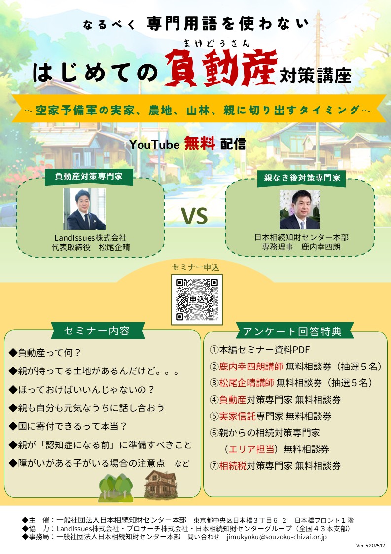多くの皆さまにぜひご覧いただきたい大切な内容をお届けするWebセミナー『はじめての負動産対策講座』の視聴期間を、皆さまからのご要望にお応えして、《無期限延長》することとなりました。 ご家族ととも ...