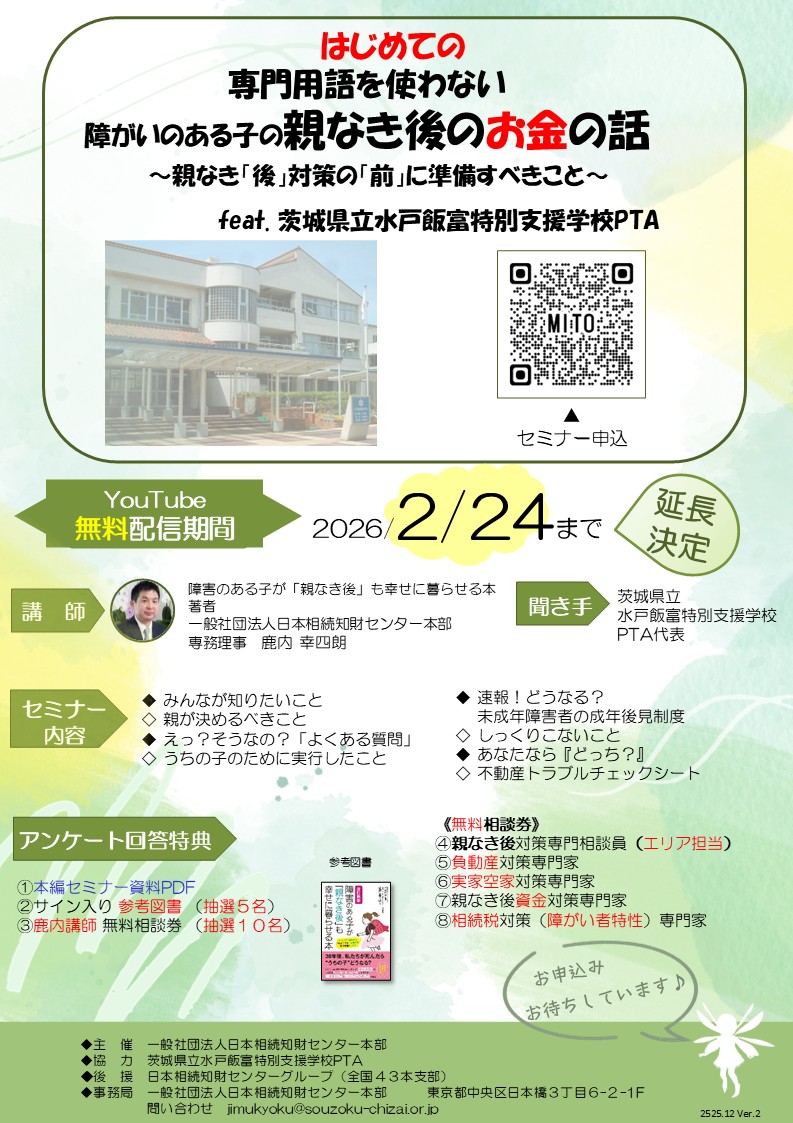 当センター専務理事鹿内幸四朗が、茨城県立水戸飯富特別支援学校様よりお招きいただき、障がいのある子の親なき後の「お金」の話について講演をさせていただきました。その様子を茨城新聞に取材いただき、2025年 ...
